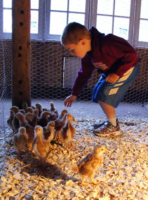 The boys would kind of like to hold them, but don't like how the chickens' feet feel and those birds are fast! They're almost always in a flutter of activity - truly enjoying their new spacious accommodations.