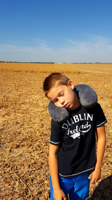 Levi went out to the field with a neck pillow since he always falls asleep in the combine!