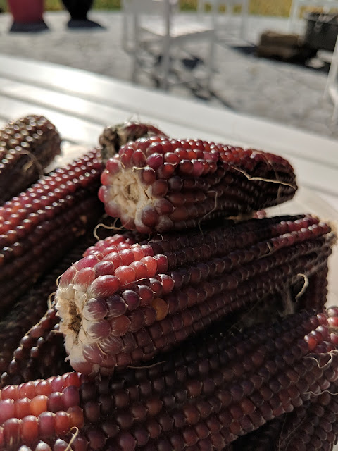 Our popcorn dried for several weeks in our house and on a beautiful fall afternoon it was time to get the kernels off the cob!